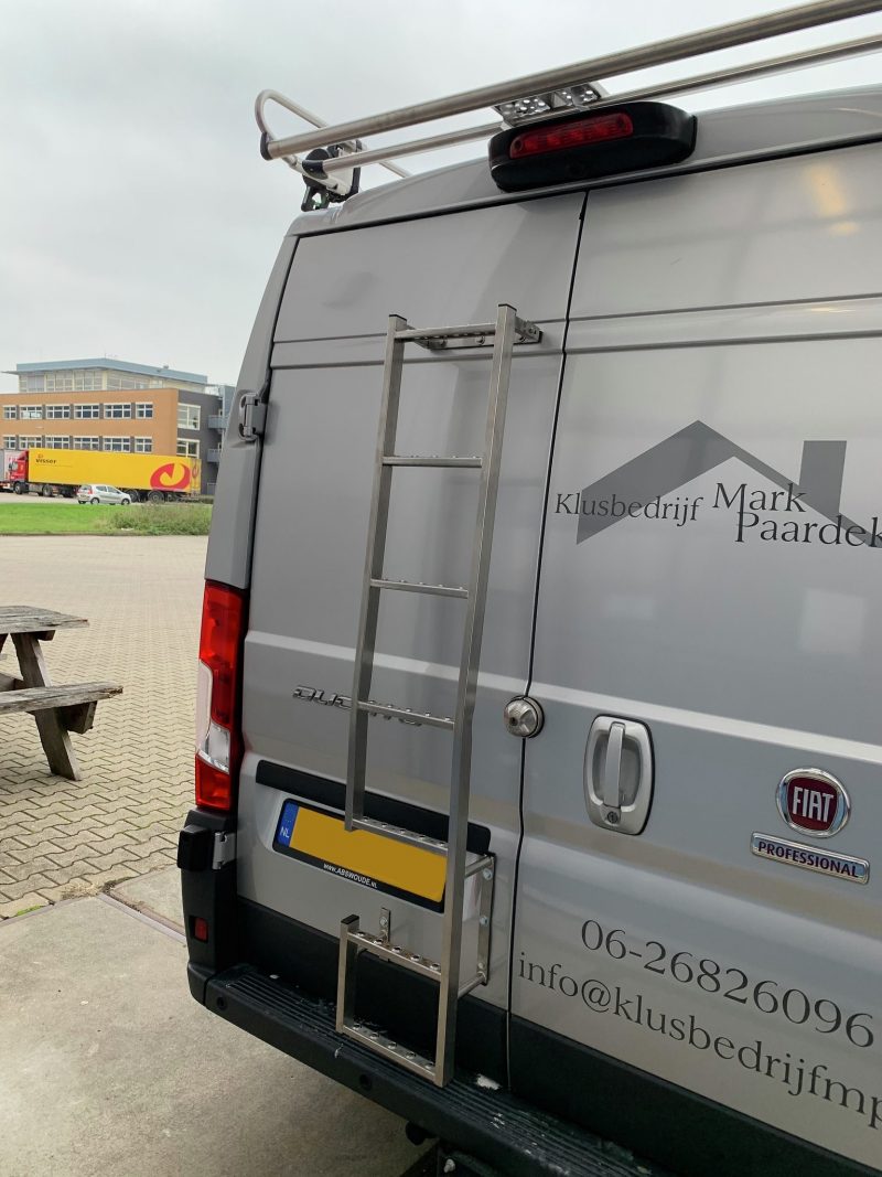 Wat wij gedaan hebben? Deze Fiat Ducato hebben wij voorzien van het volgende, Rvs Imperiaal Rvs Deurladder Rvs Loopplank Roll & Fix Strapboxen 4M Buizenkoker