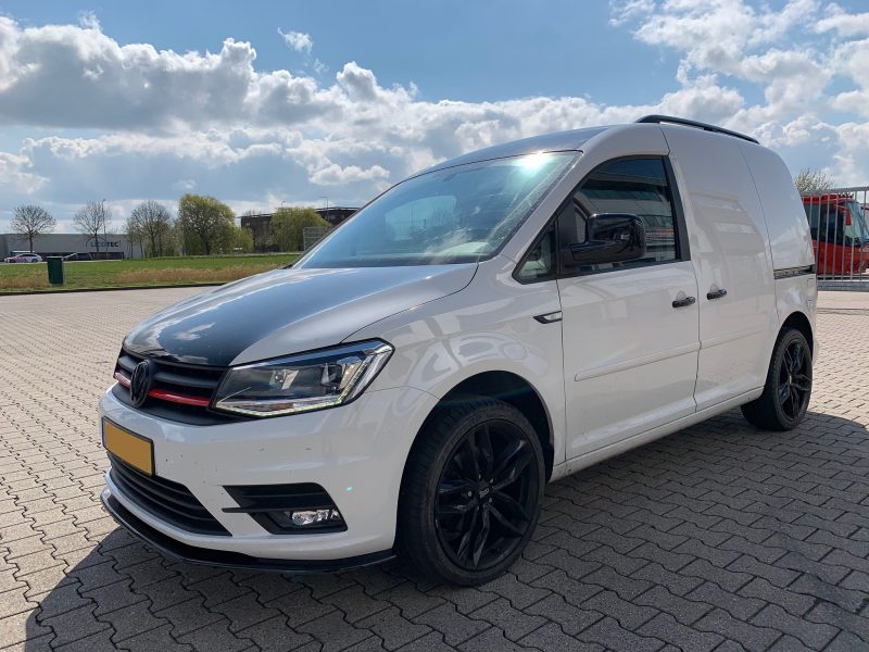 Deze mooie Volkswagen Caddy voorzien van zwarte accessoires.