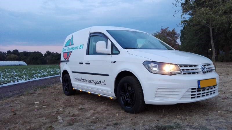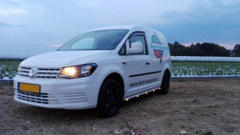 Deze mooie nieuwe Vw Caddy van Bom Transport is uitgevoerd met Rvs sidebars met led verlichting.