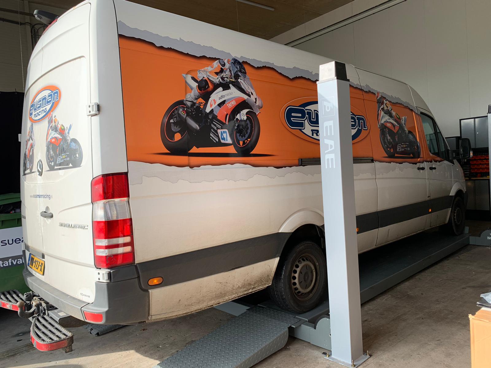 Zaterdag 29 februari hebben we een nieuwe 4 koloms hefbrug geplaatst zodat nu alle lengtes bestelauto’s op de hefbrug kunnen om onze mooie bestelauto accessoires te kunnen monteren, zie foto van de Mercedes Sprinter lengte 4, geen probleem alles past er nu mooi op.
