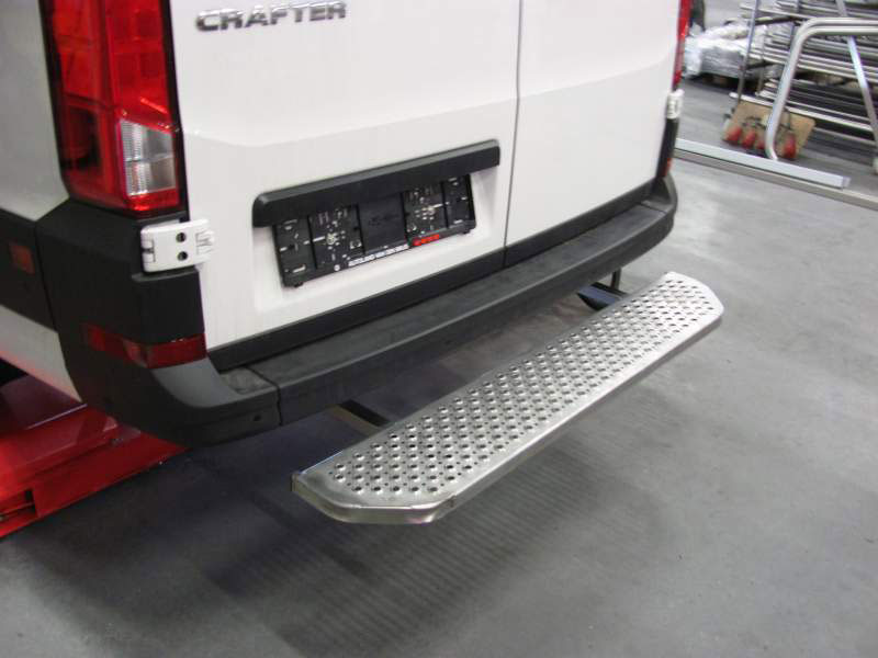 Achteropstap Volkswagen Crafter. Een opstap is geen overbodige luxe bij het instappen van uw laadruimte. Veel bestelauto’s hebben een hoge instap wat het zeer lastig maakt om de laadruimte te betreden. Om de instap en uitstap te vergemakkelijken hebben wij een aantal aluminium opstap treden in ons assortiment voor montage op iedere bestelauto zonder een trekhaak. Een achteropstap is een onmisbare accessoire wanneer u dagelijks de laadruimte via de achterkant van uw bestelauto wilt betreden. Vooral wanneer u ook nog eens met zwaar materiaal moet tillen geeft een achteropstap u enorm veel voordelen. Een opstaptrede geeft u zo een handige opstap voor de laadruimte van uw bestelauto. Door de antislip-ribbels maakt u het in- en uitstappen een stuk comfortabeler en bovendien ook vele malen veiliger, want uitglijden is toch wel het allerlaatste wat u wilt. Wij leveren zowel smalle opstappen als opstappen die over de gehele breedte van de bus lopen. Dit kan bij veel modellen met behoud van trekhaak. We verkopen ook opstappen die u aan de trekhaak kunt monteren en toch nog uw aanhangwagen kunt blijven gebruiken. Onze opstappen zijn snel en eenvoudig te monteren. Bij een achteropstap voor bestelauto’s met een trekhaak kunt u eenvoudig de bouten van de trekhaak losdraaien en de opstap hiervoor in de plaats te monteren. De achteropstappen voor bestelauto’s zonder trekhaak worden aan het chassis op de standaard montagepunten gemonteerd. U hoeft hiervoor dus niet te boren. Uiteraard leveren wij bij iedere achteropstap de benodigde montagematerialen en een montagehandleiding.
