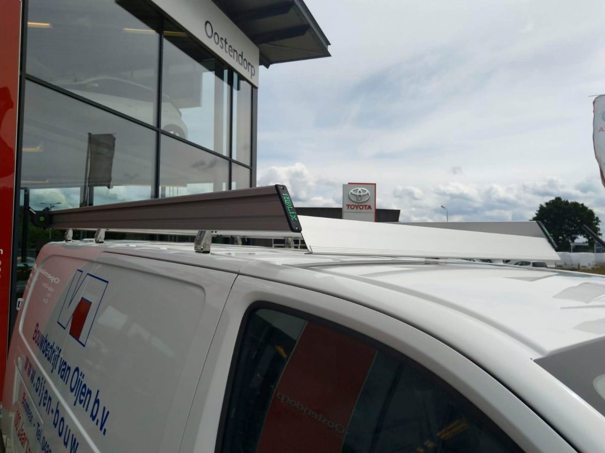 De telescopische ladder die bij dit systeem hoort. Kun je uitklappen en aan de laadrol of aan de zijkant van je imperiaal bevestigen. De lip valt als het waren over de rand van de laad rol en imperiaal, zodat deze stevig vast zit. Je kunt nu makkelijk je lading vastmaken. Ben je klaar dan hang je de ladder op aan de binnenkant van je deur.