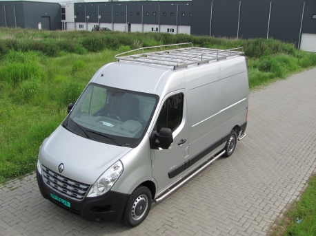 Renault Master Imperiaal RVS. Onze imperiaal wordt pasklaar ontworpen voor elk type bestelauto. Klaar voor dagelijks professioneel gebruik. De zijkanten van het imperiaal hebben een open frame, zodat de lading maximaal toegankelijk en het vastmaken van de lading eenvoudiger wordt. Alle profielen zijn van rond buismateriaal gemaakt, niet alleen mooi om te zien maar ook nog eens ideaal bij het vastsjorren van de lading. Alle imperialen worden standaard met een ladderrol uitgevoerd en tijdens het laden is er maximaal zijwaartse steun doordat de reling doorloopt tot voorbij de rol. Een ontwerp waar over nagedacht is! Om de voorste drager van het imperiaal is een anti-windruis-wikkel gemonteerd. Door deze wikkel is een grote spoiler niet noodzakelijk en blijft het geluid in de cabine aangenaam stil zonder hinderlijke ruis. Onze imperiaal is speciaal ontworpen voor de zware dagelijkse praktijk. Volledig gelast, dus geen lastig bouwpakket en ook worden onze imperialen standaard voorzien van een ladderrol aan de achterzijde.